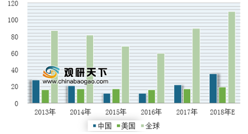 2013-2018年E全球、美國與中國工程機(jī)械銷量對(duì)比(單位:萬臺(tái))